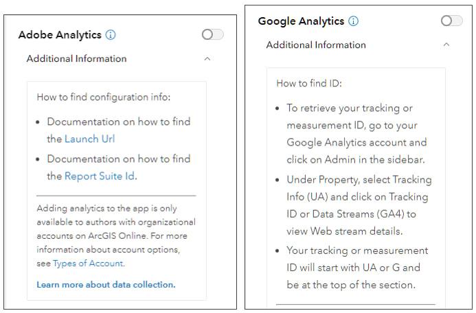 Once you’ve completed Step 2 above, an additional Web analytics option appears in the toolbar for all ArcGIS Instant Apps. This option appears in both express and full setup modes. Note: Adding analytics to apps is only available to authors with organizational accounts.