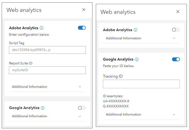 Step 6 — Toggle the desired analytics on, then complete the required configuration settings. For Adobe enter the Tracking Server and Report Suite ID, for Google enter the Tracking ID.