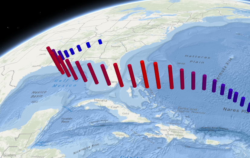 But working with 3D objects can be more complex. Objects like cylinders and pyramids have three axes to consider: height, width (diameter from east to west), and depth (diameter from north to south). The axis property on the size visual variable allows us to define each of these values. In the hurricane sample below, we set a constant size on the width and depth axes to make all cylinder diameters the same size (50km). The height axis is used to set the height of each feature between 60km and 450km based on the value of the WIND_KTS field.