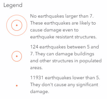 The data is dynamic, every time a user opens or refreshes the application the data changes. Generally, the last class with earthquakes with magnitudes higher than 7 is likely to stay empty (we sure hope that’s the case!). Having empty classes is not a best practice when classifying data because it confuses the user. We could reclassify the data, but these classes are based on the effects that earthquakes have, rather than clusters within the data. So we’d like to keep the classes as they are and to give the user information about how many earthquakes are in each class, we use outStatistics with the queryFeatures method to obtain the number of earthquakes in each class. We set these numbers in the labels of each class, so that they are displayed nicely in the legend:
