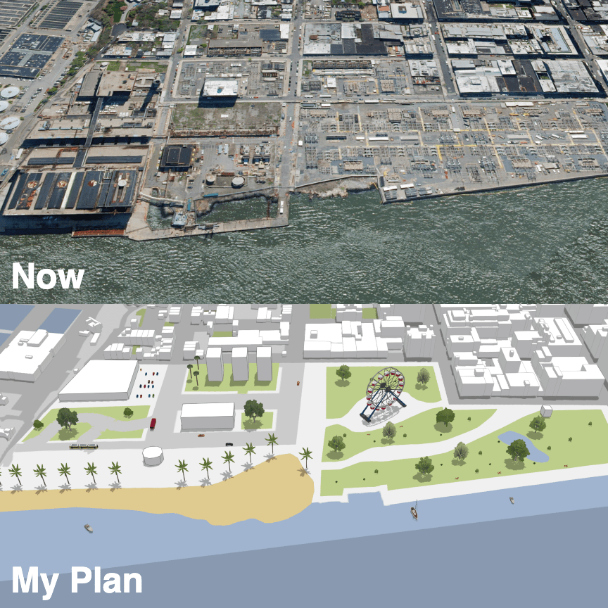 For simplicity we decided to create a snapshot using the screenshot API. Besides the user-created sketch, we also take a snapshot of what the area looks like today. This is accomplished showing the satellite basemap using the same perspective. Combining both screenshots together we get a nice before/after view of the area:
