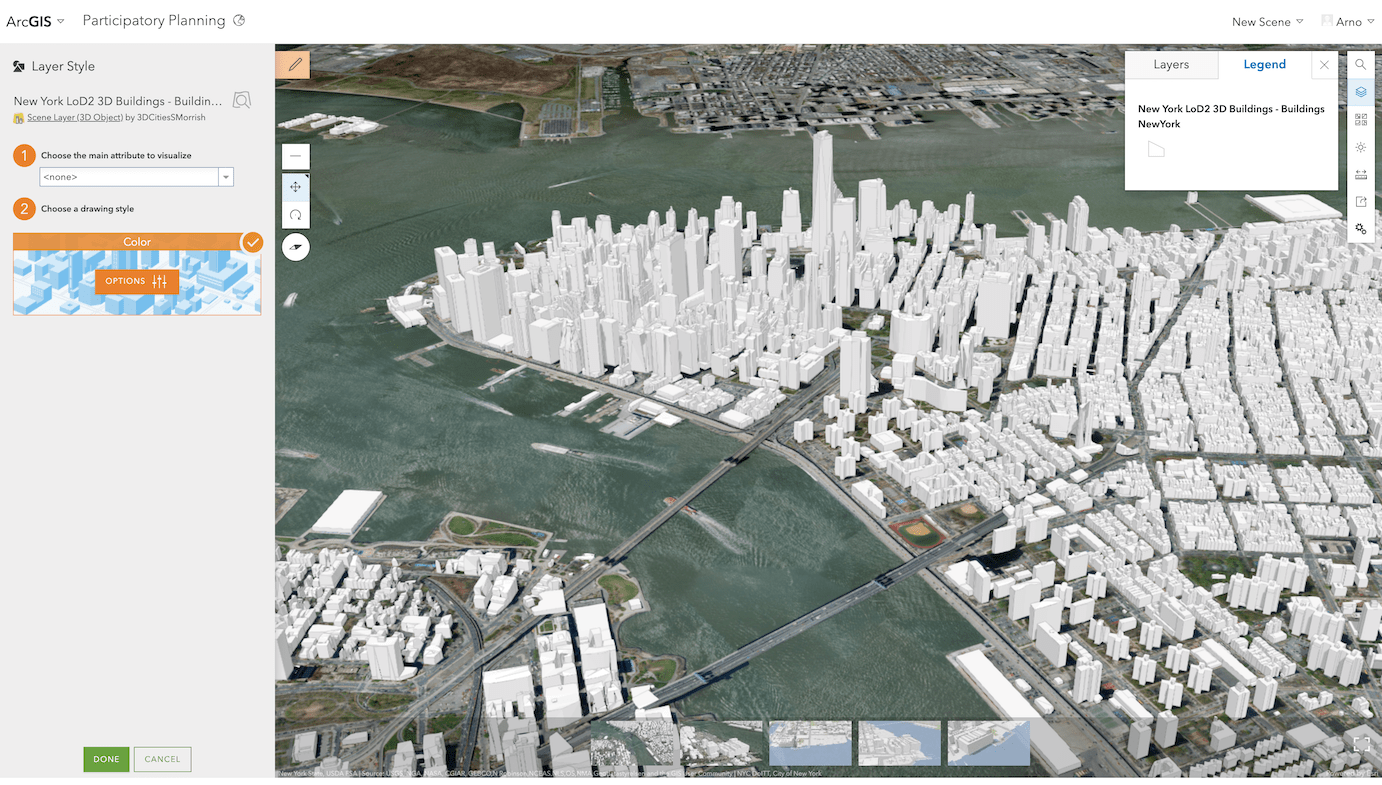 Participatory planning usually takes place in cities where a predefined lot is being redeveloped. Space is dense and to make the proposals more meaningful we would like to show the surrounding buildings. Luckily many cities like New York provide 3D buildings as open source data. Being available as a SceneLayer on ArcGIS Online we can go straight ahead and import all buildings into our web scene.