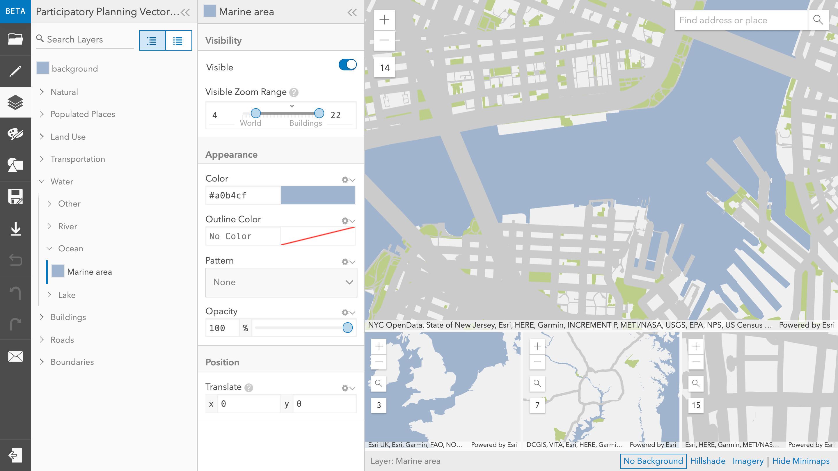 To keep things simple, I decided to create a very simplified basemap for the app. With the help of the new Vector Tile Editor it was possible to create such a basemap in no time. Starting with the basic Light Gray vector-based tile layer, I mapped every type of feature to one of the following ground types, each having a distinct color: land, parks, water, streets and walking paths.