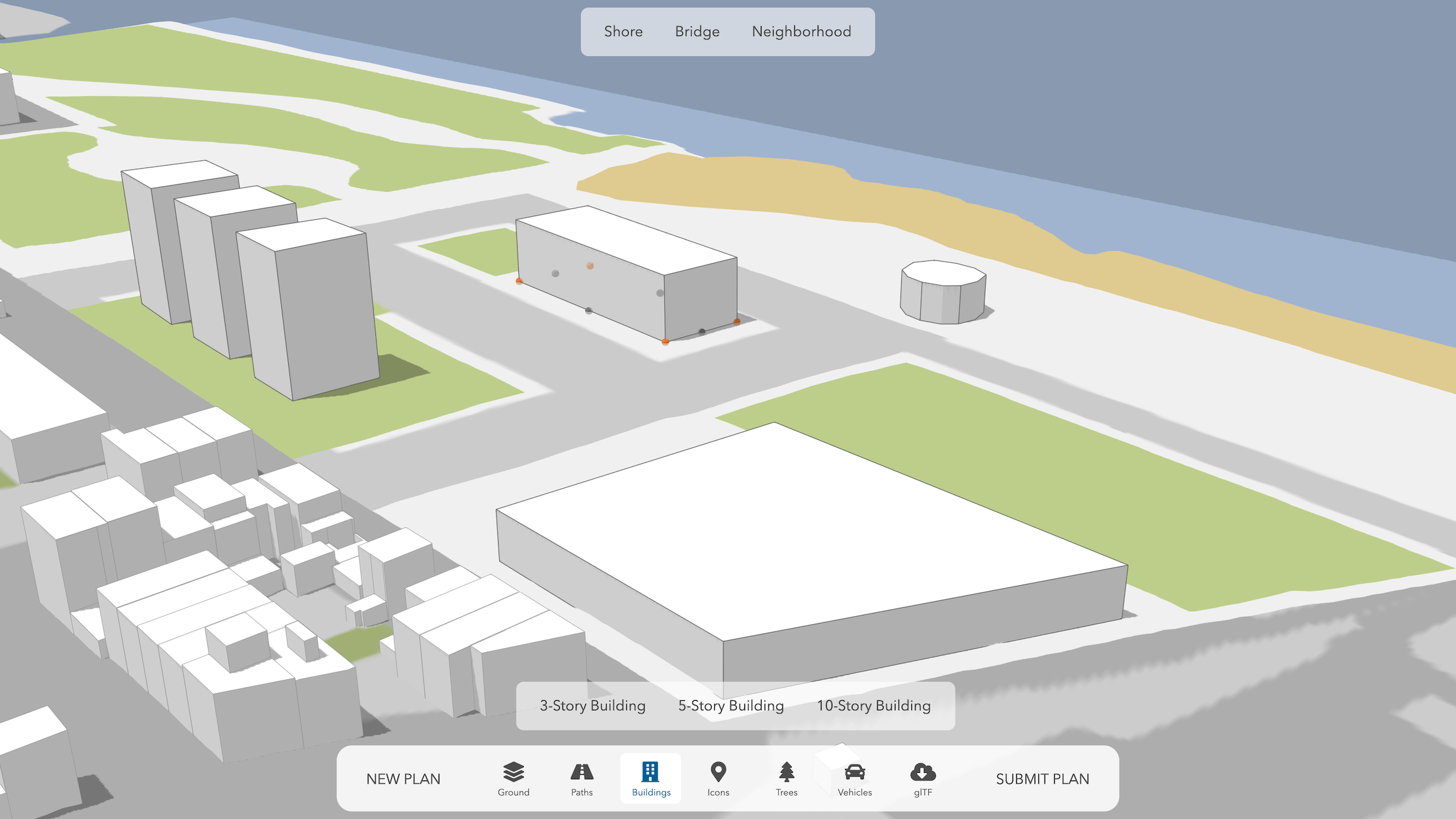 The next thing any user would probably want to do at this point is place a few buildings. Because anyone should be able to use a citizen engagement app, we want to keep the options simple while allowing for creativity. Given that it seemed like a good compromise to allow arbitrary footprints while restricting the building heights to three different numbers of floors: 3, 5 and 10.