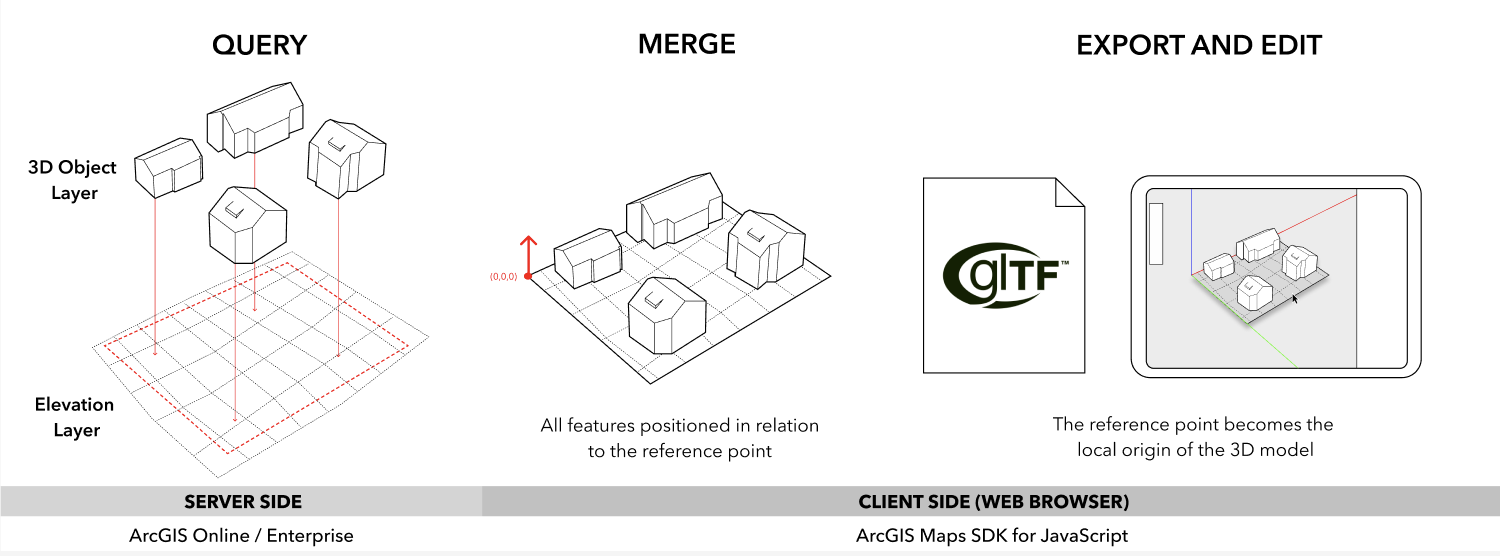 Manipulating 3D models such as buildings directly in the browser requires having the 3D geometry in an interoperable format. For web applications, the common format is GLB – also known as binary glTF. Here’s the awesome part: our team at the Esri R&D Center Zurich made 3D data manipulation and access available as a public API. This means you can use the JavaScript Maps SDK to implement custom workflows and applications using your 3D data, ultimately empowering authoritative data providers to increase interoperability and accessibility of their 3D system of record.