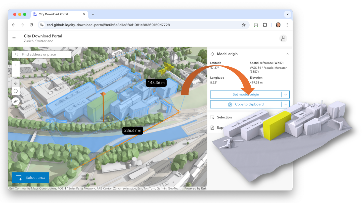 Because we are moving 3D data between a GIS and 3D modeling software, maintaining consistency in coordinate systems and origins across tools is crucial. By keeping a fixed reference point and orientation, newly modeled 3D data will align perfectly when re-imported back into ArcGIS. While this is outside the scope of our new City Download Portal showcase, it can be achieved with a 3D object layer in Scene Viewer or any other JavaScript Maps SDK powered editing app for that matter.