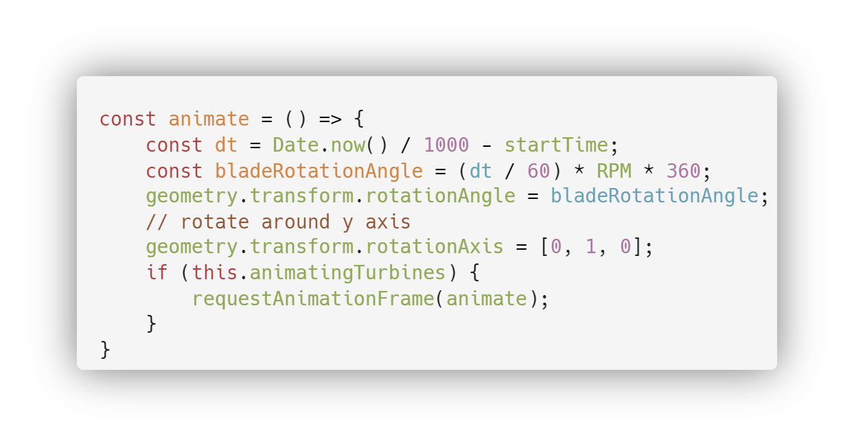 To create the animation we need to calculate the angle of rotation on the y axis based on the elapsed time since the animation started and the RPM value. RPM tells us how many full rotations a blade does in one minute. So the rotation angle will be bladeRotationAngle = elapsedTime * RPM * 360, where elapsedTime is expressed in minutes. I am multiplying by 360 because the rotation takes an angle in degrees.