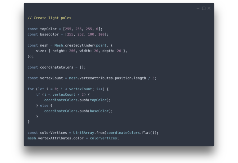 I’ve also added light beams that match the night theme to help locate the models around the scene, as some of them are hidden between buildings. Additionally, users can explore models using cards that display a picture of the model. All three elements – models, light beams, and cards – are interconnected, helping to explore the art. Hovering over a card, animates the corresponding light beam as you can see in the code example, while clicking on a card takes the user to the model.