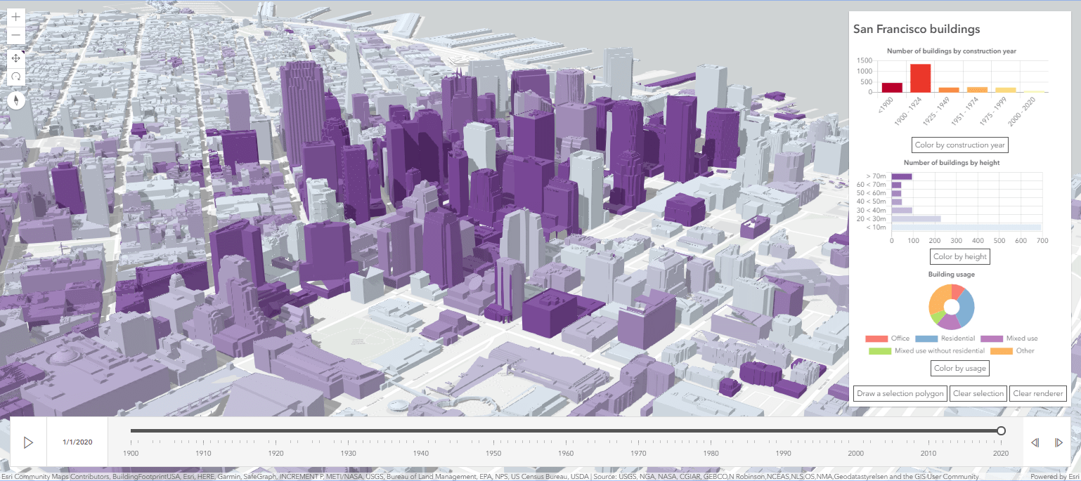 Are you ready to create your first 3D web app? Start with the A Holistic Approach to Building 3D Web Apps session. It is a practical session that covers the full workflow of authoring web scenes in ArcGIS Online and Enterprise all the way to building interactive 3D web apps. Learn the concepts behind creating this San Francisco building explorer, an interactive application to explore buildings in a city by construction date, height, and building usage. The ArcGIS API for JavaScript: Fundamentals for Building 3D Web Apps session then goes a bit deeper by taking you through the fundamental 3D building blocks of the API: SceneView, 2D and 3D layers, terrain, and symbology.
