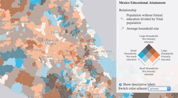 SmartMapping in 3.25 includes a relationship renderer which allows you to map patterns within a single map and help you see if two things are related. This is done using a technique known as bivariate choropleth mapping, where two color ramps combine into a grid-like legend showing all pattern combinations. Learn more about creating maps that explore relationships between layers. Web maps that contain layers with relationship rendering can also be read in 4.8.
