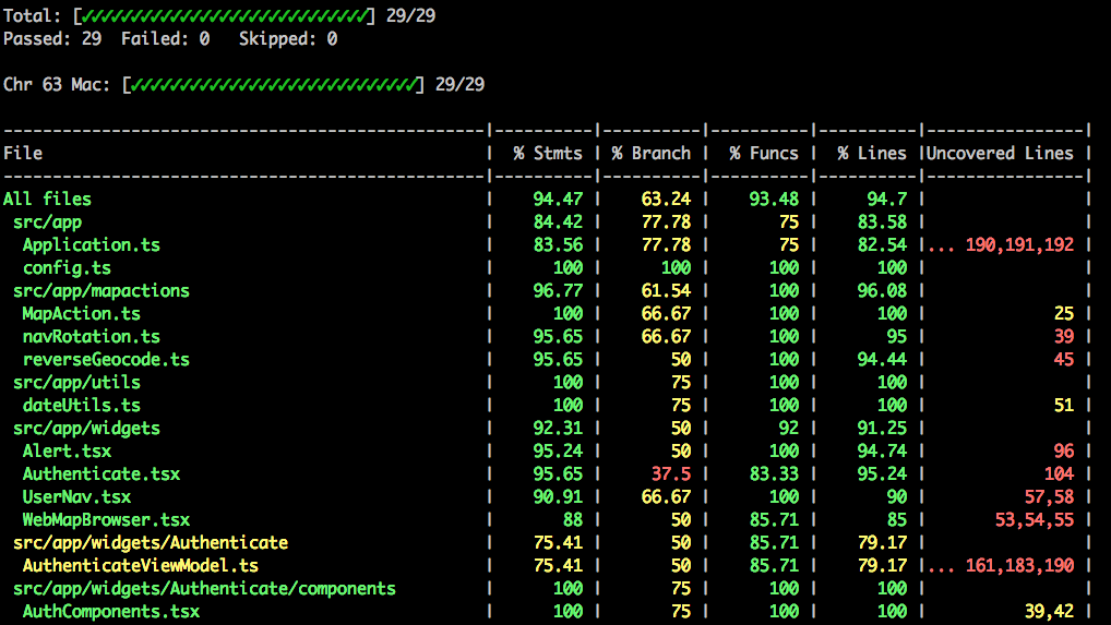 In addition to using all of these development tools, we also include a handy testing process. The Maps App uses Intern 4 for unit testing and provides a number of example unit tests you can review. Unit testing is a way to test pieces of your application to help isolate the issue, and can be extremely useful to find problems early in the development process.