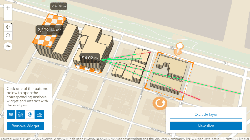 Programmatically perform client-side measurements, slices and line of sight analysis and then display the results in your scene. You can also pass the analyses to the constructor of the corresponding widget to set their initial state and allow for further user interaction.
