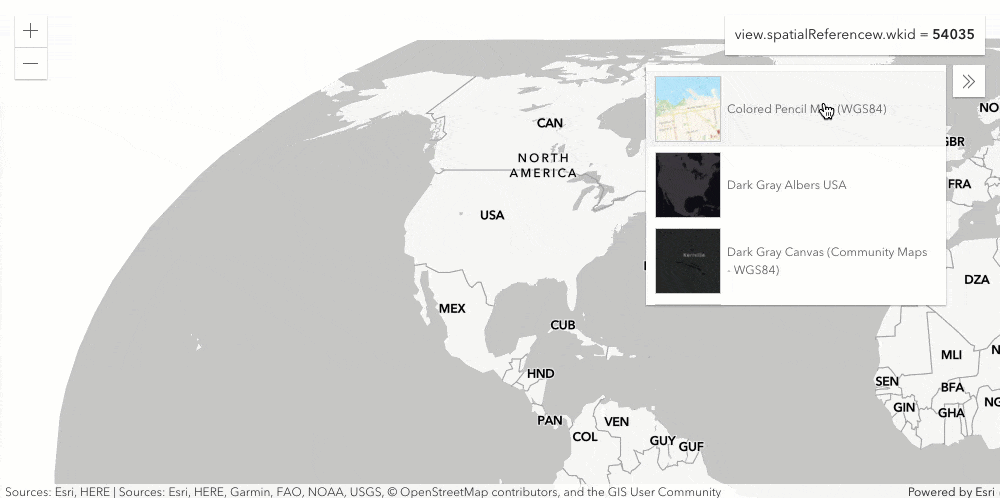 Easily switch the spatial reference of your map by simply setting the spatialReference property, or by changing to another basemap with a different spatial reference via the Basemap Gallery or Basemap Toggle widgets. This means that if you are using the Basemap Gallery widget, you can have basemaps with different spatial references for your end users to select from. Likewise, the Basemap Toggle can switch between two basemaps with different spatial references.