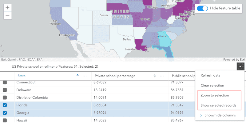 When rows are selected in the table, two new menu items will be displayed: Show selected records and Zoom to selection. These can also be called programmatically.