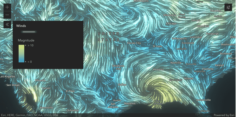 The following sample uses the FlowRenderer with visual variables to visualize wind speeds during Hurricane Ida. Learn more in the Create an animated flow visualization with the ArcGIS API for JavaScript blog.