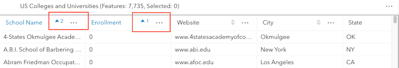 Sort multiple fields, with control over what column gets prioritized over others when the table initially displays. The image below shows the second column, “Enrollment”, having a higher sort priority than the “School Name.”