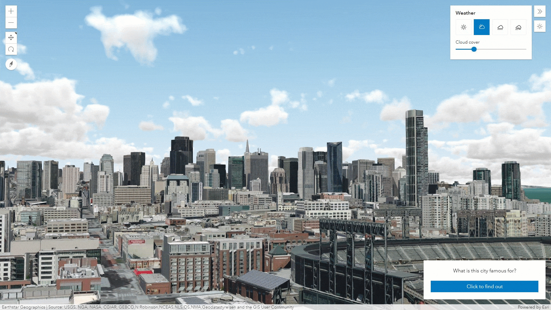 Change the weather between sunny, cloudy, rainy, and foggy in your scene using the new weather widget. You can interactively adjust the cloud cover or fog density using the widget’s slider.