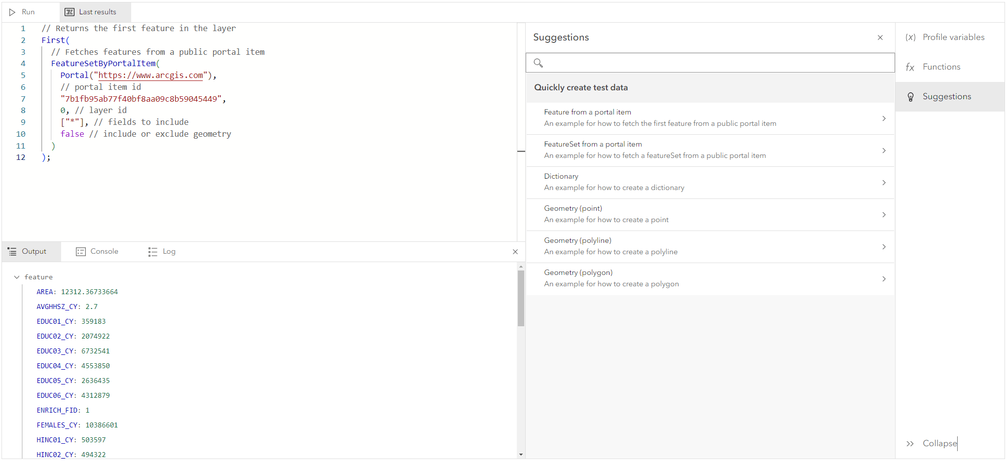 Coding components are planned to contain a wide range of tools, resources, code editors, and utilities that support coding. Currently, we offer the Arcade editor component that allows the end user to create Arcade expressions that drive aspects of your map or app within your solution. They will have the same experience editing their Arcade expressions as they do in Map Viewer and the Arcade playground.
