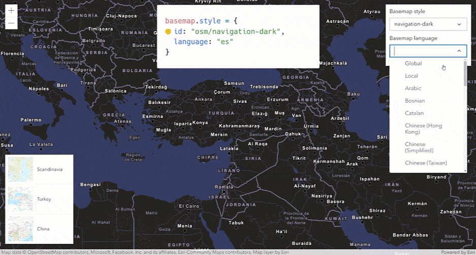 This release brings support for a new basemap styles API with localized place labels from the basemap styles service (v2). These basemaps can be created from a string in the form of {provider}/{style}, where provider is “arcgis” or “osm”. In addition to style, you can also specify a language for the labels. If no language is specified, the app’s current locale will be used to determine the language of the place labels.