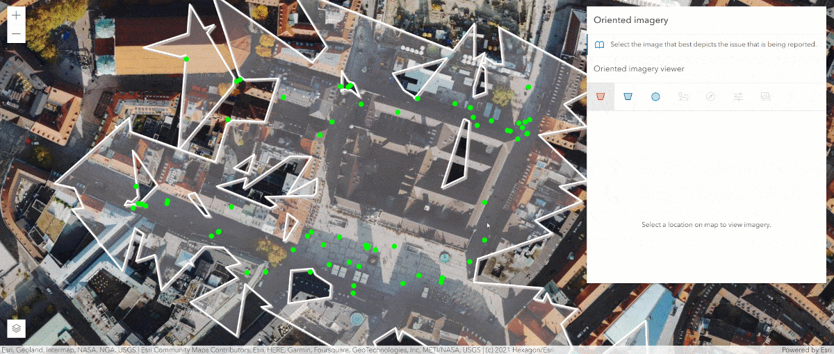 JavaScript Maps SDK’s new Oriented Imagery Layer enables you to interact with your collection of oriented images. The layer consists of point features displaying the camera locations and a geometry showing the area on the map that the camera covers. Using the accompanying Oriented Imagery Viewer widget, you can click on a map to view the best image in your collection that depicts that location, then examine assets from multiple directions and enhance the images for better visual analysis.