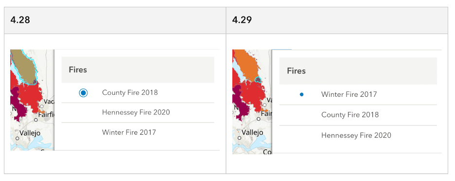In this release, the following widgets were updated with Calcite components: BasemapLayerList, BasemapToggle, Fullscreen, Home, LayerList, Locate, NavigationToggle, ScaleBar, TableList, Track, and Zoom.