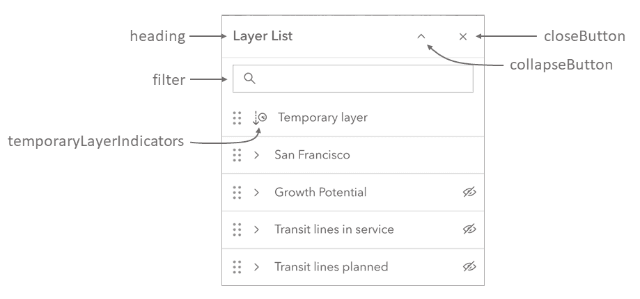Layer search: Easily find the layer you are looking for using the new filtering capability in the Layer List, Basemap Layer List, and Table List widgets. You can control whether the filter box is displayed using the visibleElements property.