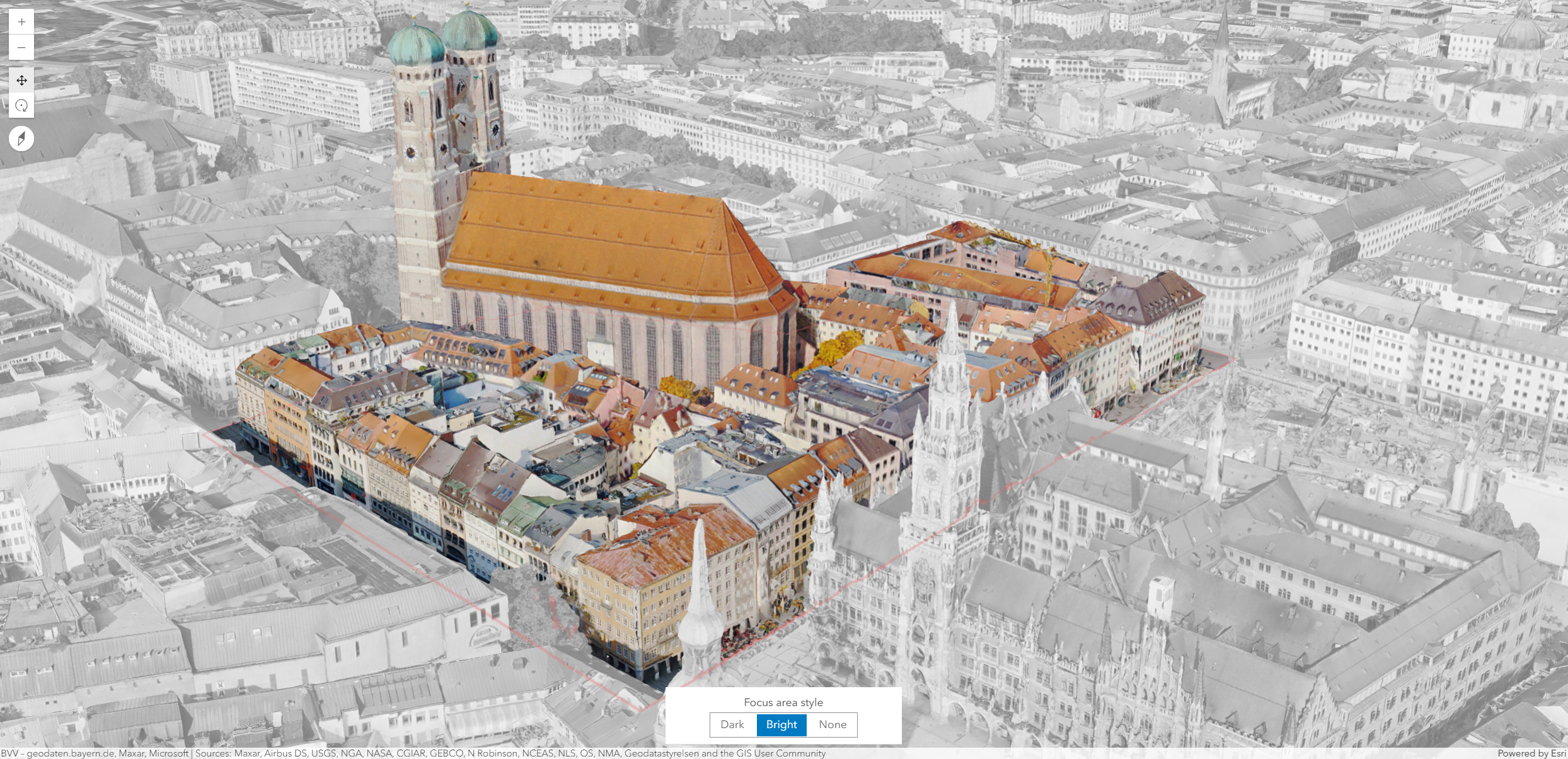 New “Focus Area” functionality allows you to highlight and draw attention to specific parts of your 3D scenes. With predefined dark or bright styles, you can emphasize an area of interest by creating a contrast with the rest of the scene. If you have multiple focus areas, you can apply a colored outline to distinguish between them. They can also be captured in slides and saved in a web scene either in Scene Viewer or programmatically.