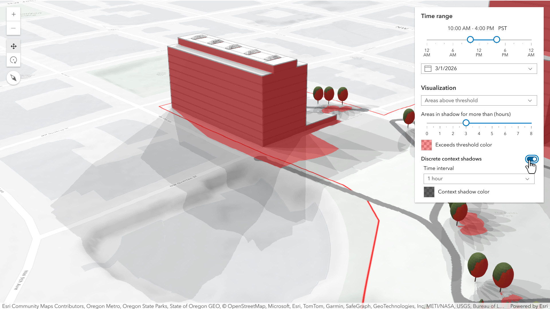 With this release, you can get additional context about the surfaces that remain in shadow longer than the threshold. Using the discrete context option, shadows rendered at specific times during the day (based on a configured interval) are composited on top of each other and displayed in addition to the threshold visualization (using distinct colors). In the below scene, you can see shadows that exceed the threshold in red, and the discrete context shadows display in grey. This enables better understanding of the amount of time something is in shadow during the day.
