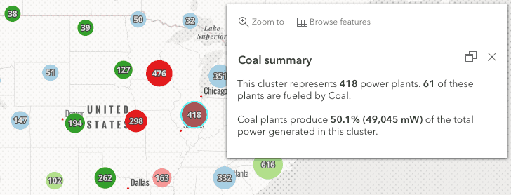 Support for clustering was added in 2020, but we’ve continued to make updates and improvements to allow you to do more with your clusters in 2021. One major update is that you can now access clustered features using Arcade expressions within the cluster popups using $aggregatedFeatures. This allows you to display more detailed information in your popup about the features that are in each cluster. You can also browse clustered features from within the popup.