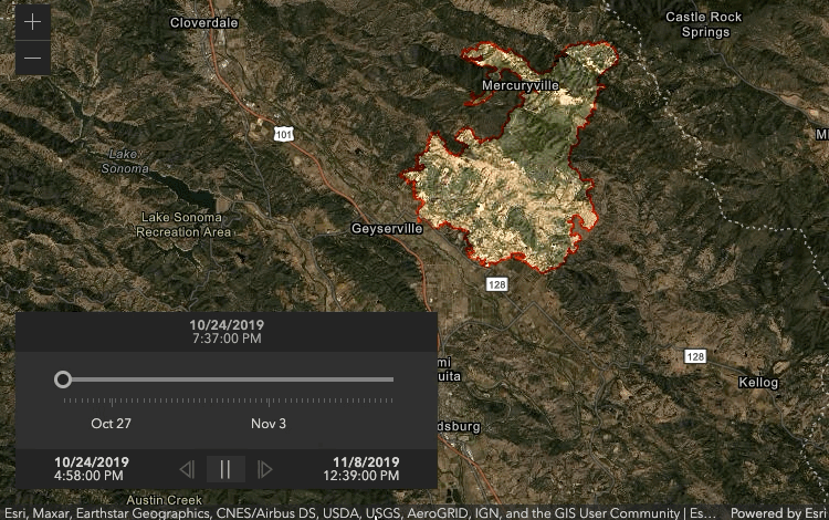 If timeInfo is not set in the service or on the layer, then you can animate the data using any date field in your service. Let’s take a look at how to do this with an example showing the spread of the Kincade Fire in 2019.