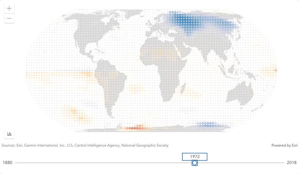The following example shows global temperature anomalies over the past 100+ years. This layer contains one field for each year – from 1880 to 2018, and as the slider updates, we update the renderer to point to the field that matches the slider.