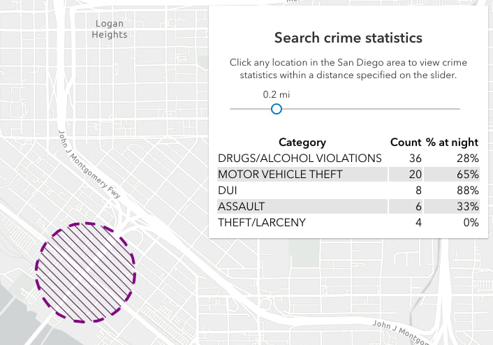 I created this app that allows the user to click a location in the San Diego area, and view statistics for the top five crimes apprehended within a distance of that point.