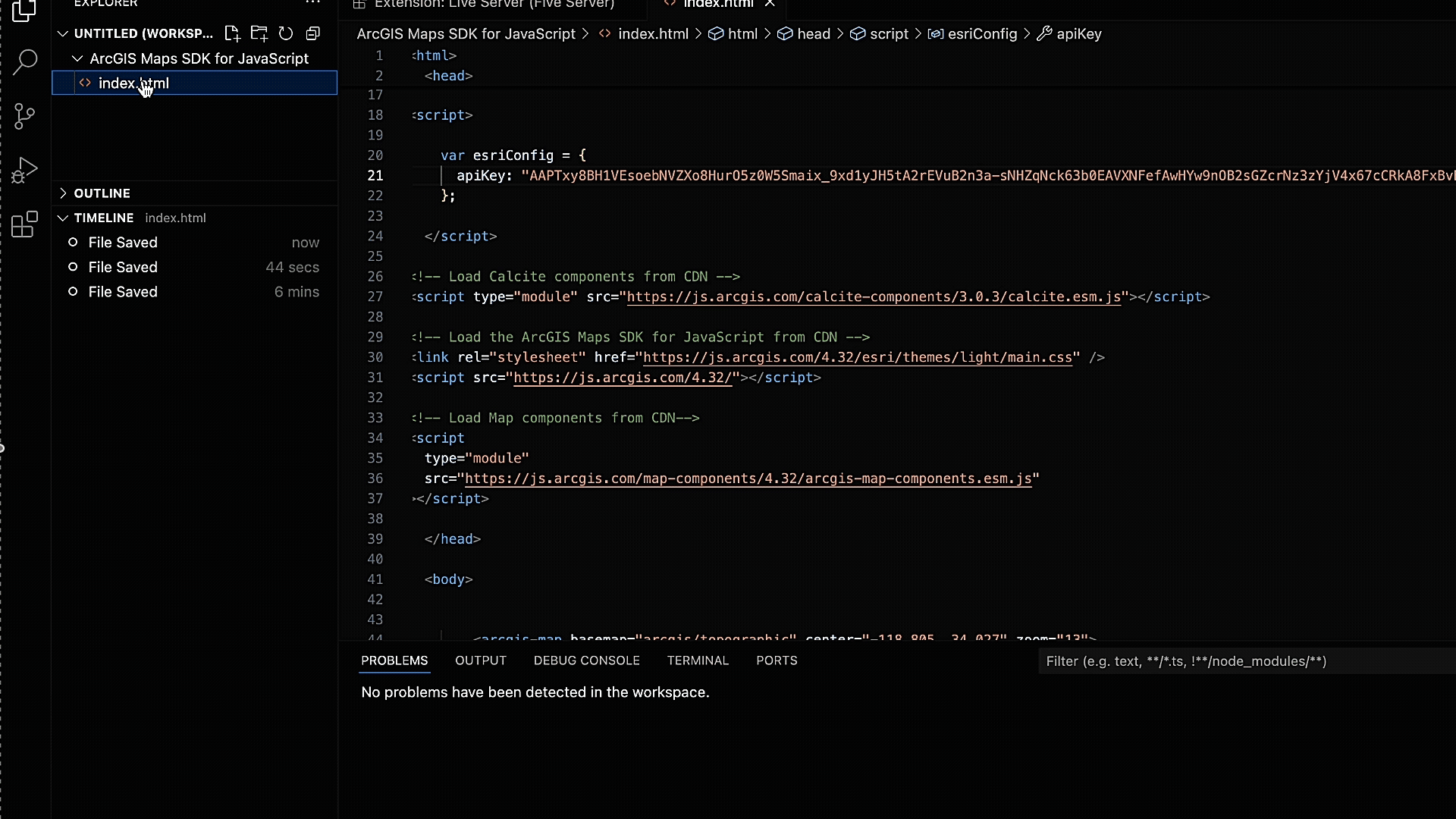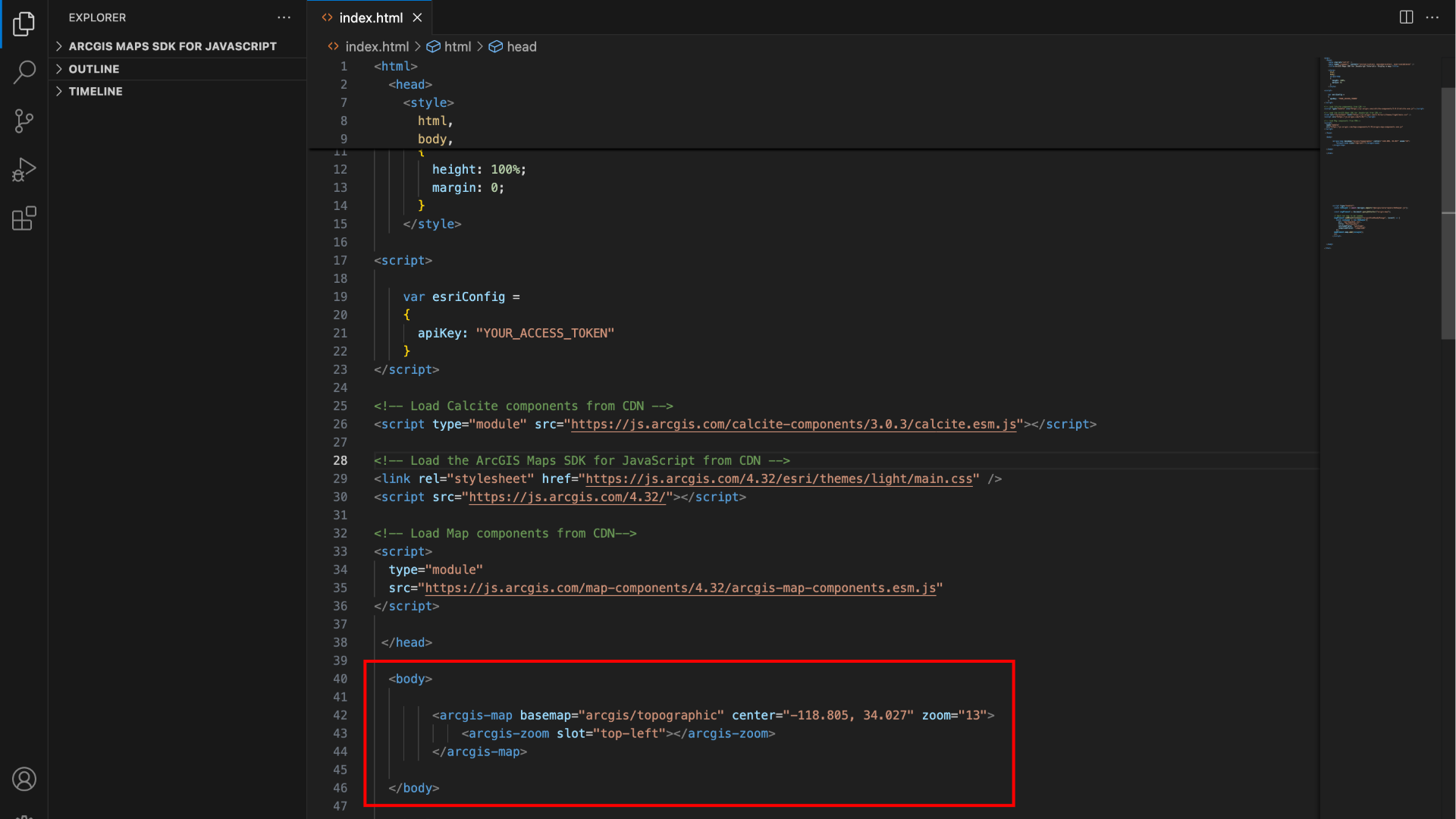 - Enter the API key that was generated in your ArcGIS Location Platform account in the “YOUR_ACCESS_TOKEN” slot.