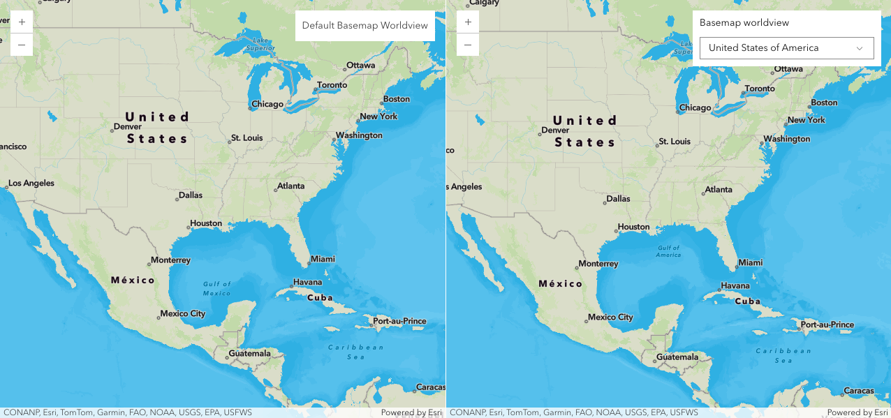 Esri recently published a new set of custom basemaps for the United States. These basemaps include updated place names recently defined by the U.S. Government, as well as updated treatments of several disputed boundaries and places previously defined by the U.S. State Department. If you are interested in learning about how to update your organizational settings and content in ArcGIS Online or ArcGIS Enterprise to use Esri’s United States vector basemaps, review Esri Vector Basemaps for United States. This blog walks through the code required to use these basemaps in new or existing apps built with ArcGIS Maps SDK for JavaScript or one of Esri’s supported open source mapping libraries.