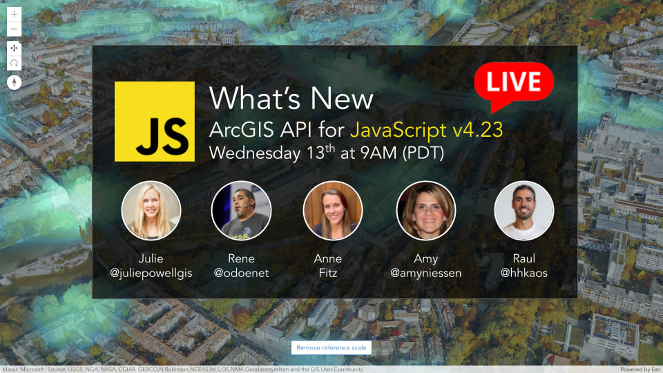 Next Wednesday, April 13th, a few members of the ArcGIS API for JavaScript team will be getting together to discuss some of the exciting new features in the 4.23 release. The best part is – you get to be a part of it! Join the livestream at 9am PDT next Wednesday to hear all about the latest and greatest in the API – directly from some of the engineers. We can’t wait to see you there!