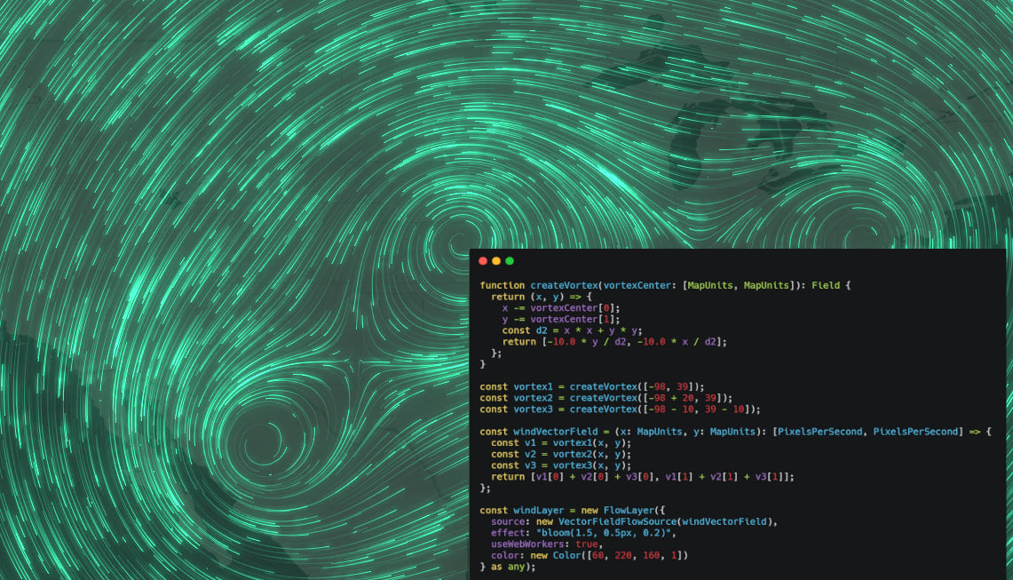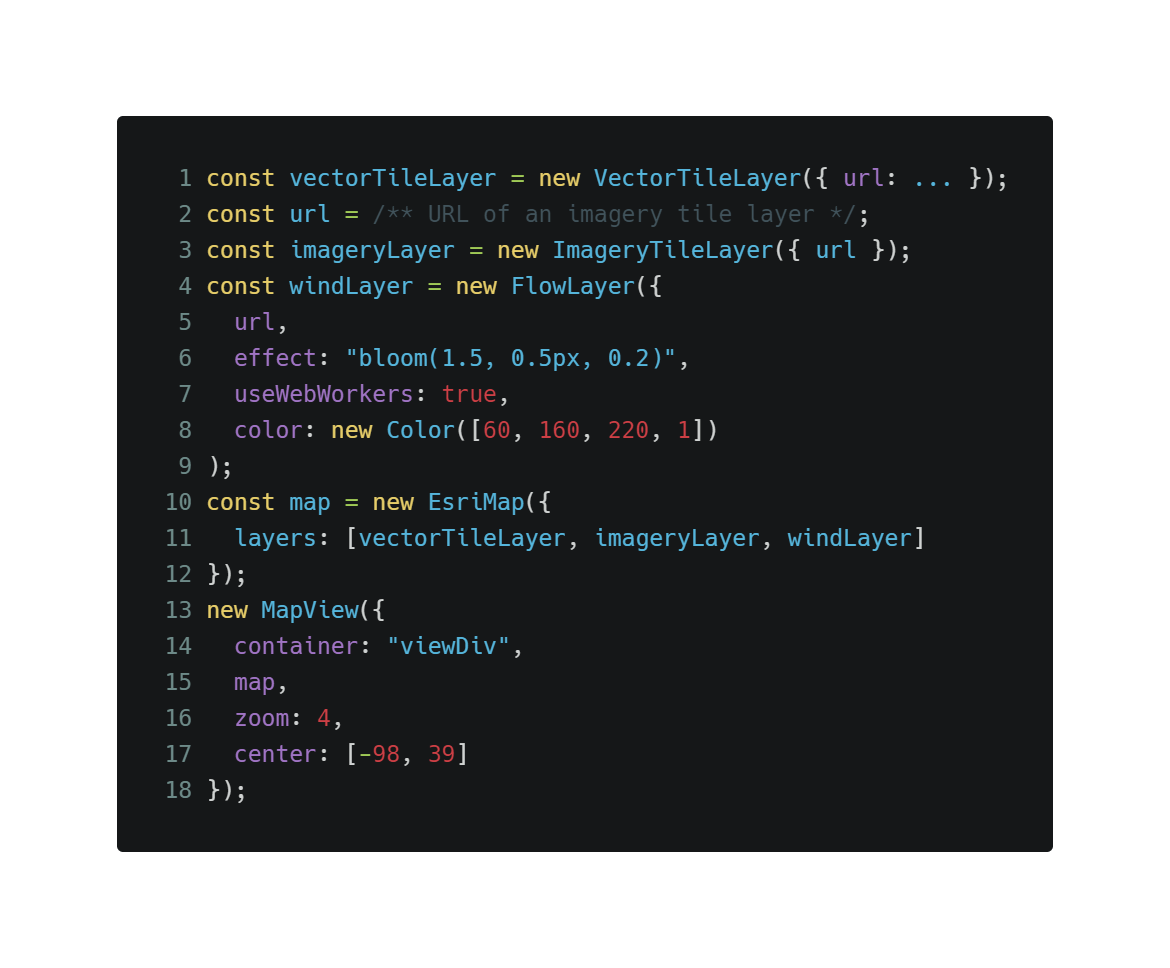 The main application file declares a VectorTileLayer to be used as a basemap, an ImageryTileLayer that will be displayed by the standard vector field renderer, and our brand-new FlowLayer pointed to the same imagery tile layer URL.