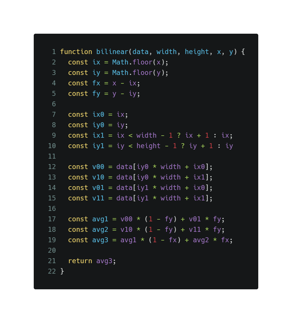 A simulated particle will have more often than not a fractional position, i.e. (42.23, 89.54). With such input, the field closure defined above would take the velocity in cell (43, 90) and return that. A better way of coming up with a value for fractional positions is to use bilinear interpolation; this allows for the velocity field to vary smoothly across a single cell and could be required to get acceptable results from the particle simulation when the wind data is low resolution.