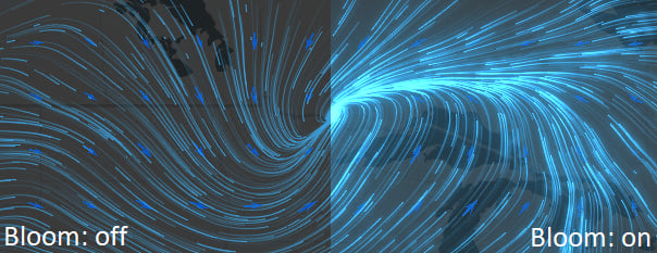 The image below shows the positive influence of the bloom effect on our custom visualization. We encourage you to try other effects and blend modes, as well as stacking other predefined operational layers on top or below FlowLayer.