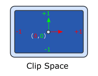 Before discussing rendering there is one additional space that needs to be introduced; it is called clip space and just like screen space describes positions on the screen, but using a different coordinate system. In clip space, the origin is in the center and the drawing area is seen as a 2x2 rectangle, where +X is right and +Y is up. This space is the space of the gl_Position variable.