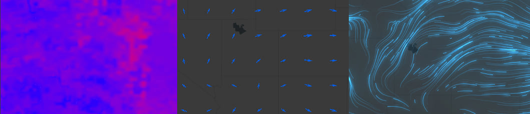 This article describes in depth the implementation of a custom WebGL layer that displays animated streamlines. A streamline is the path that a massless particle would take when immersed in the fluid. Please note that the focus of the article is on the flow visualization algorithm and integration with the ArcGIS JS API; whether the particular technique is suitable for a given dataset, audience, or application, needs to be evaluated by a domain expert, and the implementation modified as needed.