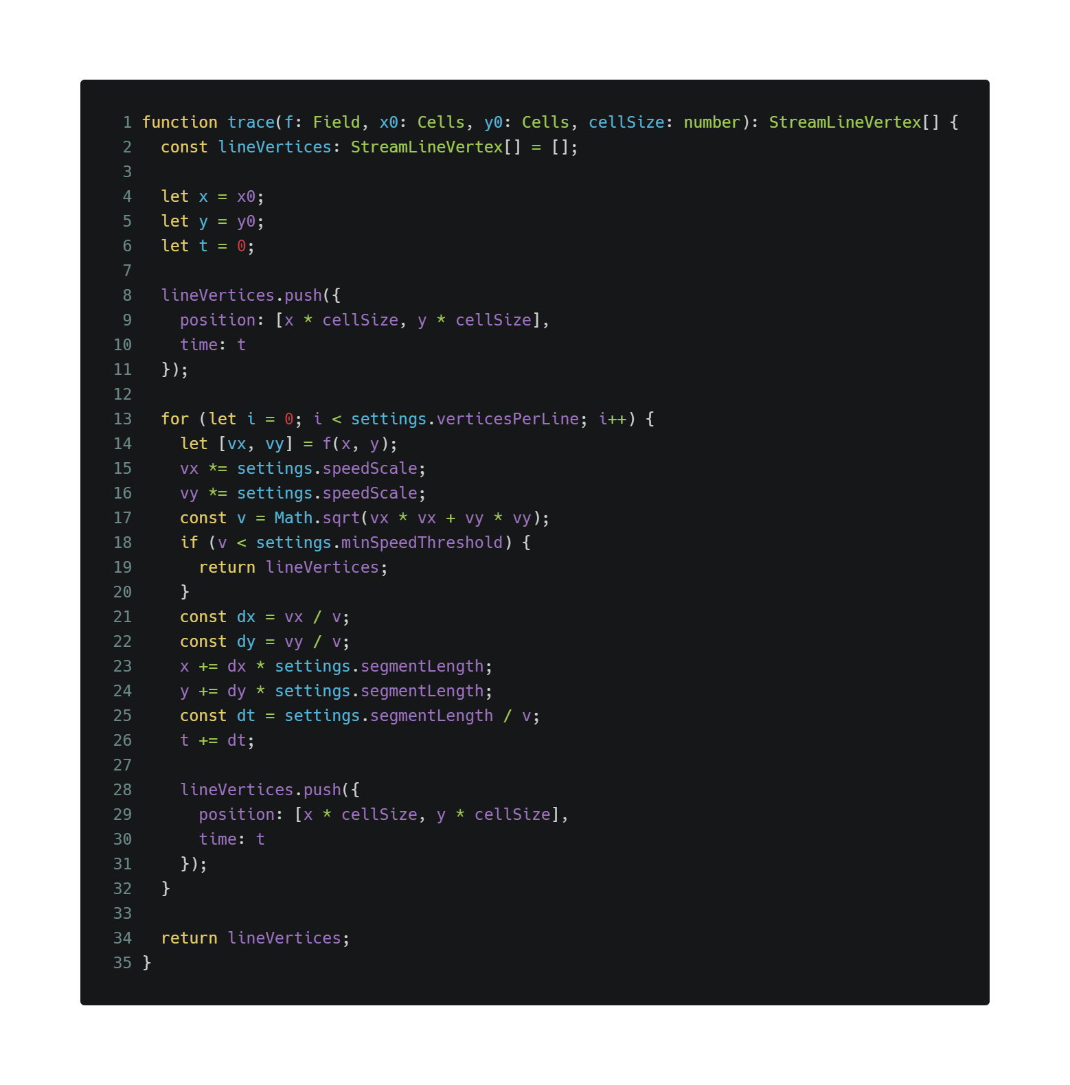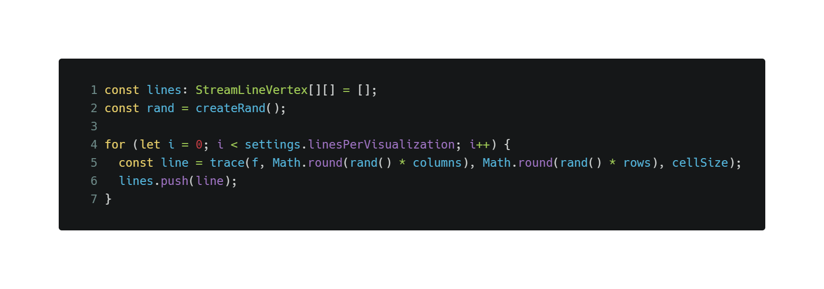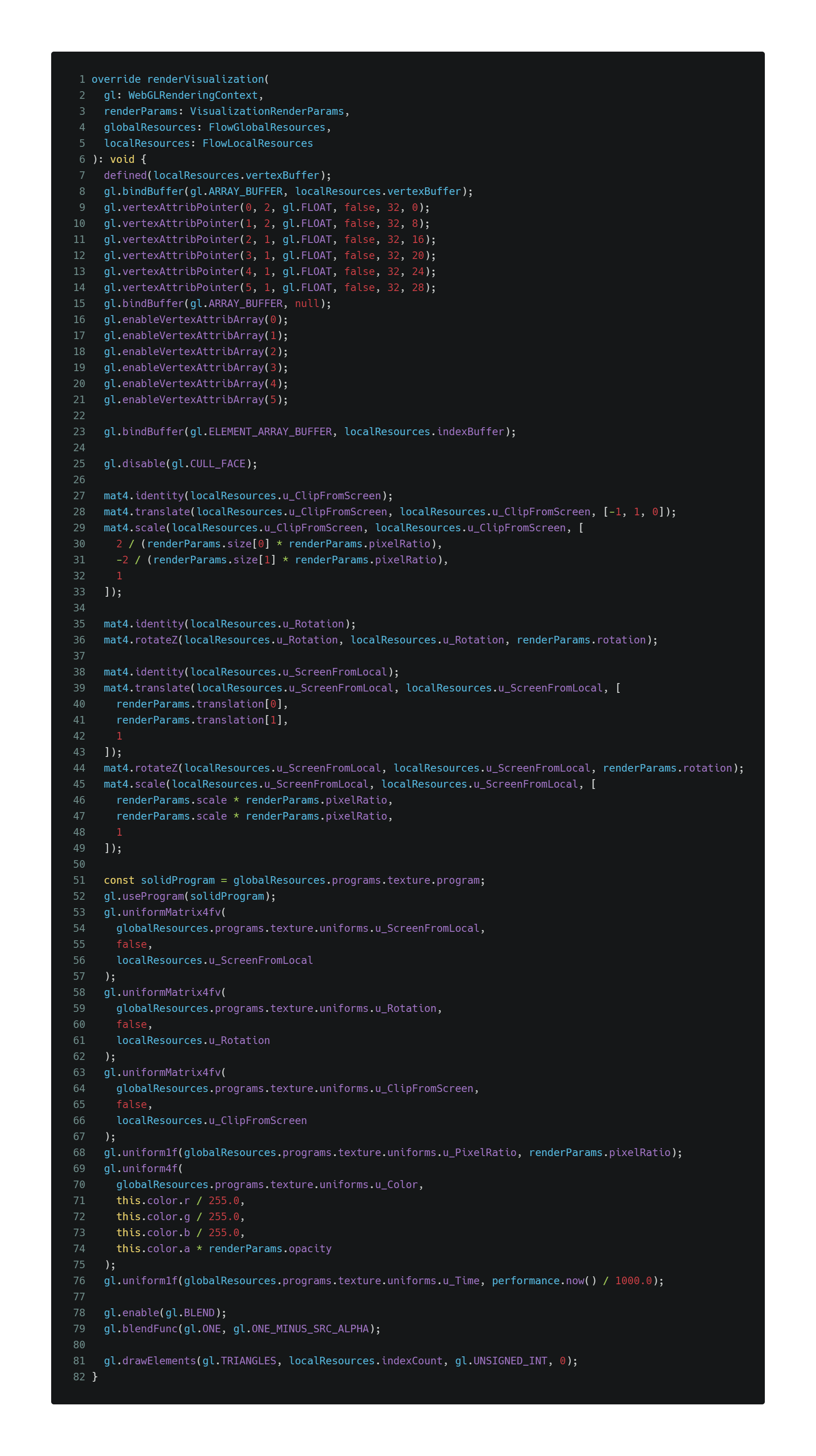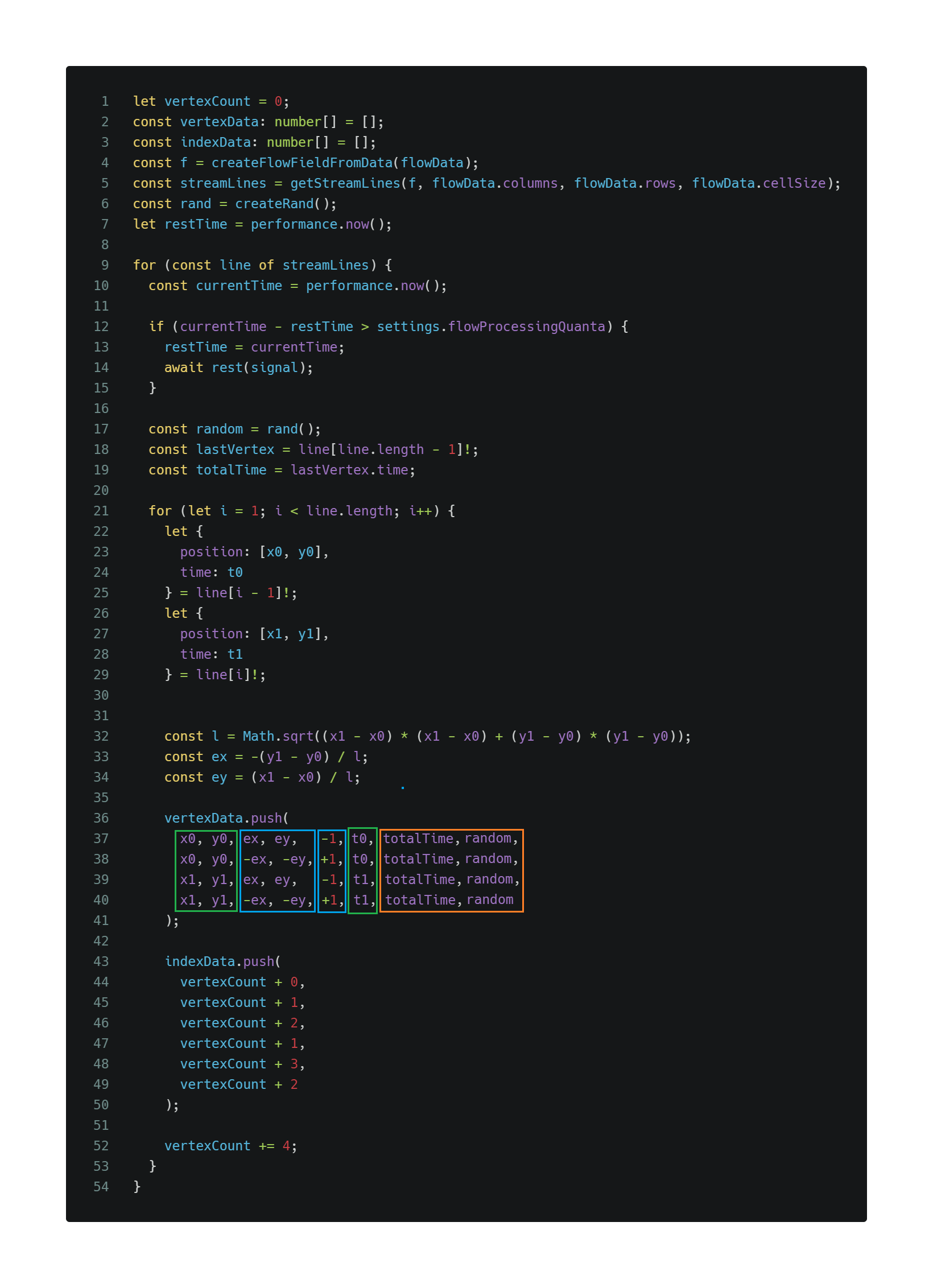 There are going to be about a thousand streamlines in a typical flow visualization; we want to render all of them using a single draw call. To achieve this, we need to store all triangle meshes for all polylines in the same vertex and index buffers. The code snippet below does just that. Note that since this could be a long-running process, the algorithm is designed to transfer control back to the event loop once in a while so that the UI thread does not freeze (lines 12-15).