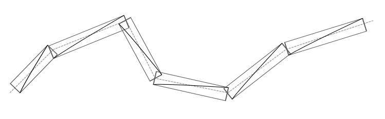 For representing streamlines our visual requirements are quite basic and we are going to stick with a very simple method; each segment of a polyline is represented by a thin rectangle, at most 2-3 pixels wide, lying along the original polyline; the original polyline becomes the centerline of this “rectangle chain”. Each rectangle is made of 4 vertices, 6 indices, and renders as a pair of right gl.TRIANGLES sharing their hypothenuse. This approach leads to gaps and regions of overlaps, but it is a very fast and robust algorithm, and for thin lines, the artifacts are not noticeable.