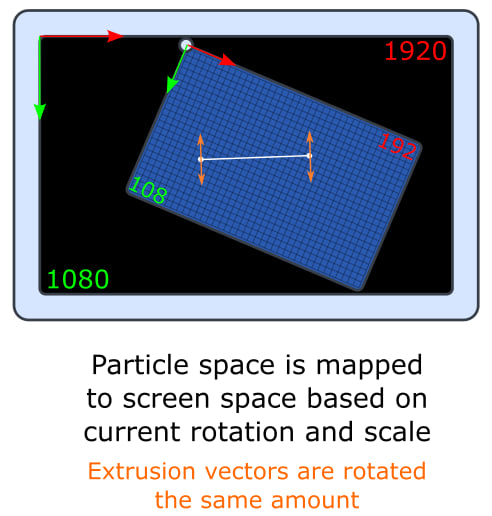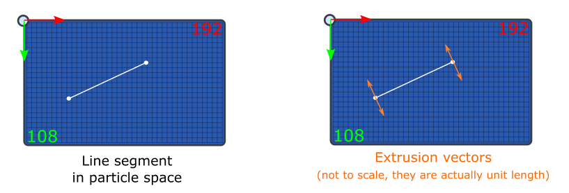 – ex, ey is the extrusion vector. This is computed at lines 32-34 by normalizing the segment vector and rotating it 90 degrees. Being normalized, its magnitude is meaningless but you can imagine it being expressed in particle space units, i.e., cells.