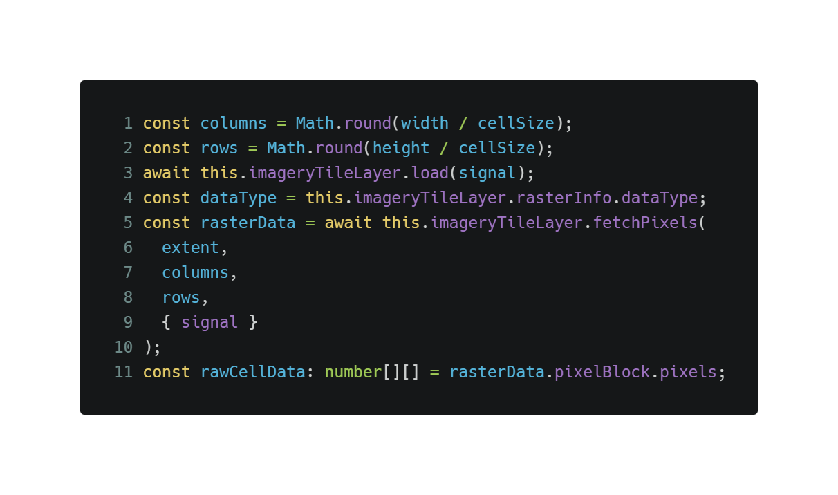 This is especially remarkable for ImageryTileLayer.fetchPixels(), which enables querying arbitrary extents in spite of the fact that the queried data is broken into tiles on the CDN. The implementation of ImageryTileLayer takes care of downloading the (possibly cached) tiles and stitches them together in a single image that spans the required extent.