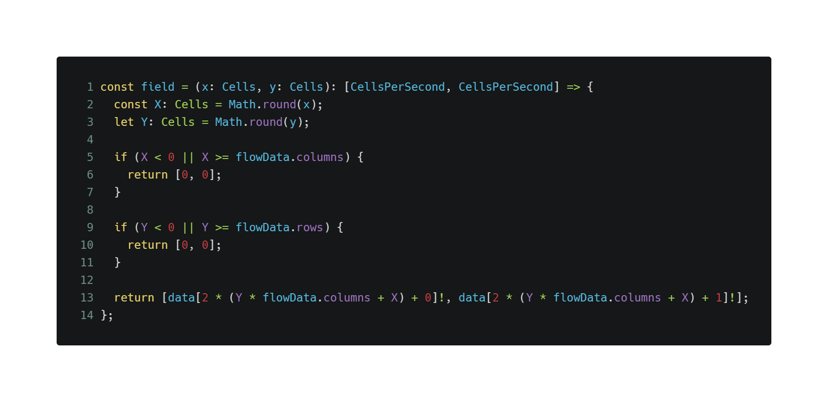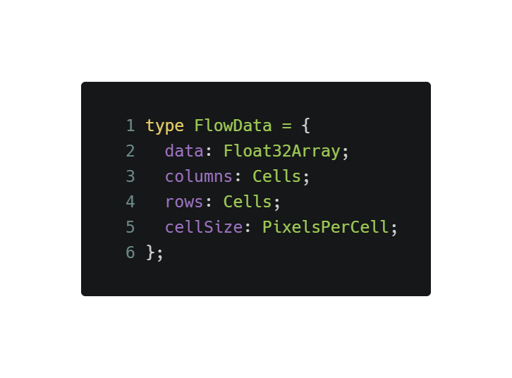 In the rest of the article, FlowData denotes a type that holds the data variable, together with the grid dimensions and the cellSize factor. FlowData is the input to the particle simulation code that traces the streamlines in particle space.