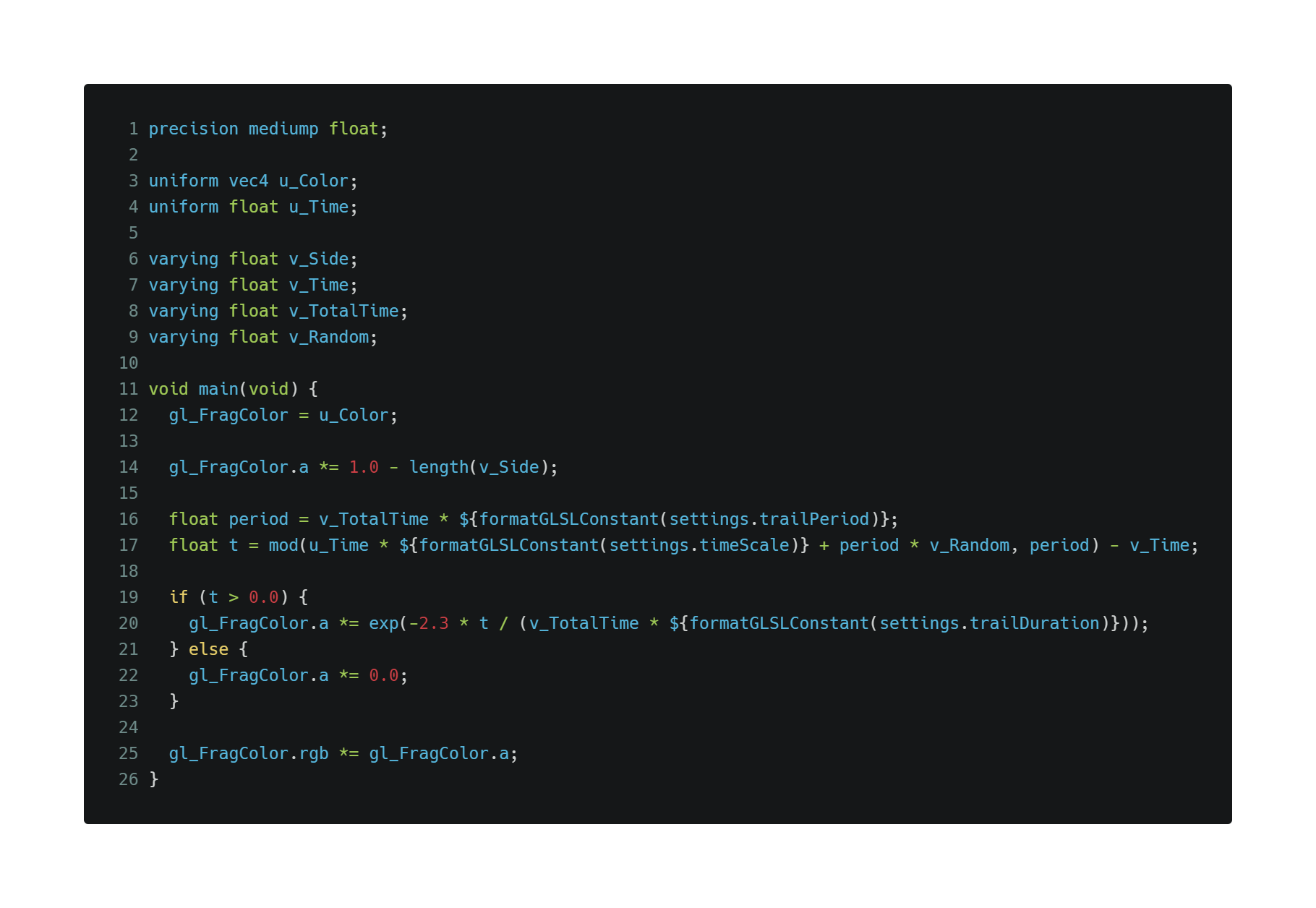 The base color of the streamlines is taken from uniform u_Color. The fragment shader modifies the opacity of the fragments to implement the animated trail effect.