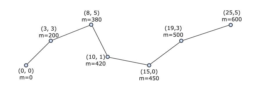 At the core of a visualization such as the one that we are setting out to build, there is the concept of a m-aware polyline feature. This is a polyline where each vertex, in addition to its coordinates, carries one or more m-values. An m-value can be thought of as a position dependent attribute of the polyline, that varies smoothly along its path; for vertices the m-value is given explicitly, while for any points between two vertices it can be obtained by linearly interpolating the value at the vertices.