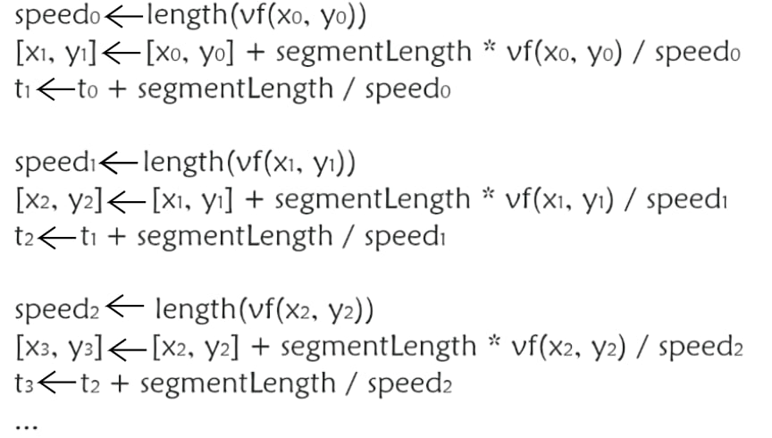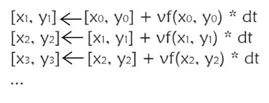 Simulating the movement of a particle in a velocity field vf is an iterative process, for which there are a couple of different approaches. The simplest one uses a fixed time step and increments the position of the particle by an amount proportional to the velocity at that point and the time step. Each iteration produces a new vertex of the polyline and, together with the previous vertex, a new segment.