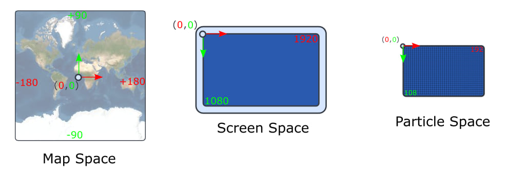 The animated lines are the result of a particle simulation. The position of a particle as it is swept by the simulated wind traces the polyline that will be later animated. The position of a particle is expressed in particle space. The units of the particle space are called cells and are related to pixels by a multiplicative constant, called cellSize. In the figure above we assume cellSize of 10 so that a 1920x1080 pixels MapView results in a 192x108 particle space.