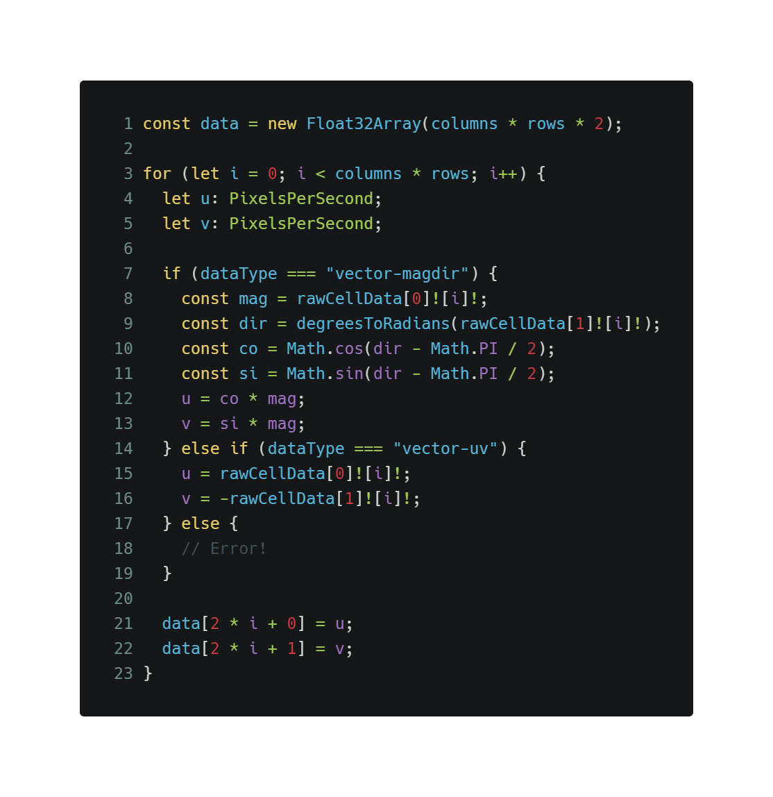 In the “MagDir to UV case” the magnitude is multiplied by sine and cosine factors to get the U and V components respectively. Note how the direction is first converted to radians, and then it is delayed by Math.PI / 2; this is needed because in particle space positive angles rotate the +X axis over the +Y axis, while in map space positive angles rotate the +Y axis (the “North”) over the +X axis (the “East”). These two conventions are both clockwise but angles in map space are a quarter of a full circle late.